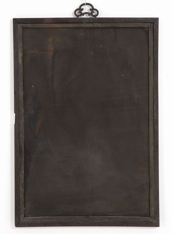 Oil painting on glass depicting "CALLIGRAPHY WITH FLOWERS AND ANIMALS". China. In frame.