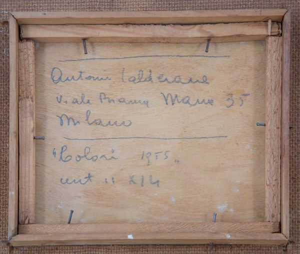 Oil painting on panel entitled "COLORI 1955". Signed lower right. Signed, titled and dated on the back. In frame. With expertise of the Antonio and Carmela Calderara Foundation n. 476.