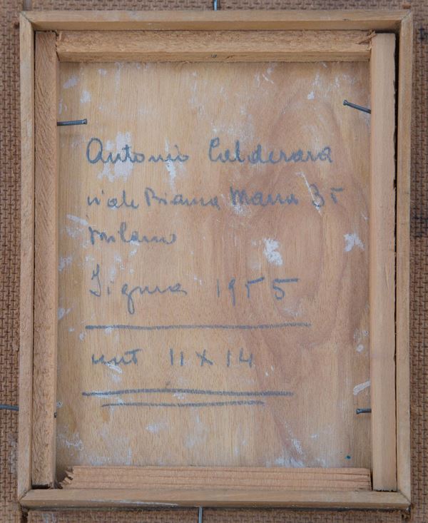Oil painting on panel entitled "LADY". Signed lower right. Signed, titled and dated 1955 on the back. In frame. With expertise of the Antonio and Carmela Calderara Foundation n. 475.