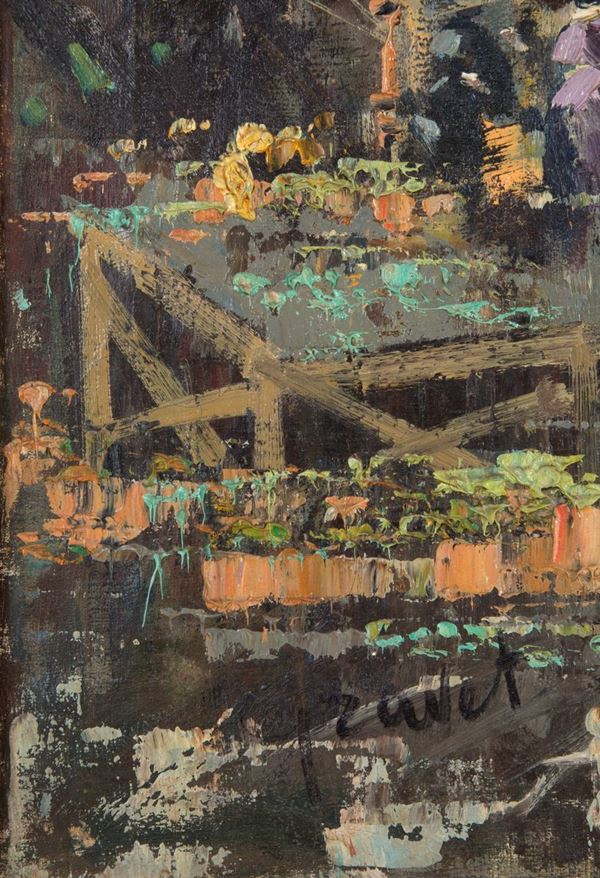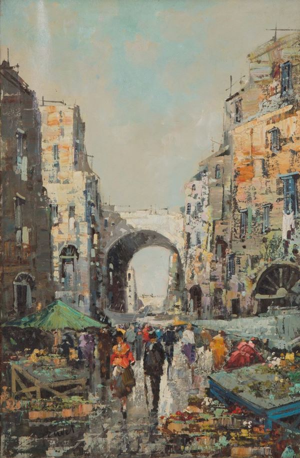 Oil painting on canvas depicting "MERCATONAPOLETANO". 20th century. Signed GRAVET in the lower left corner. In a carved and gilded frame. & Nbsp;
