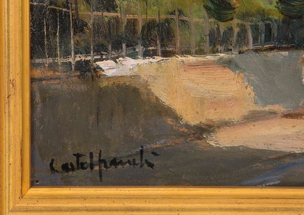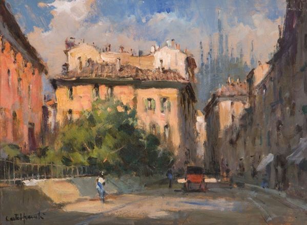Oil painting on plywood entitled "VIA STRADELLA". Signed lower left. In gilded frame.
