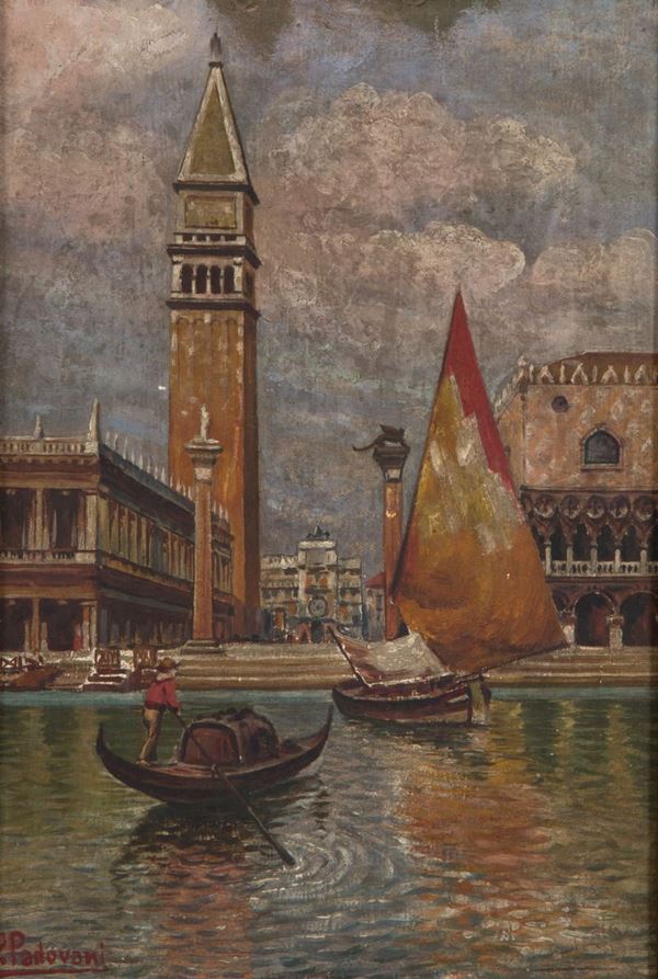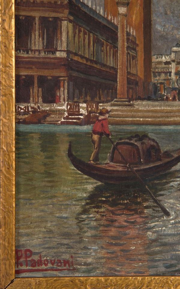 Oil painting on cardboard depicting "VIEW OF SAN MARCO SQUARE". Signed P. PADOVANI. Late 19th century. In frame.