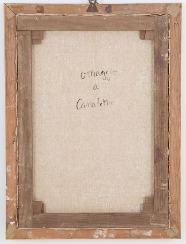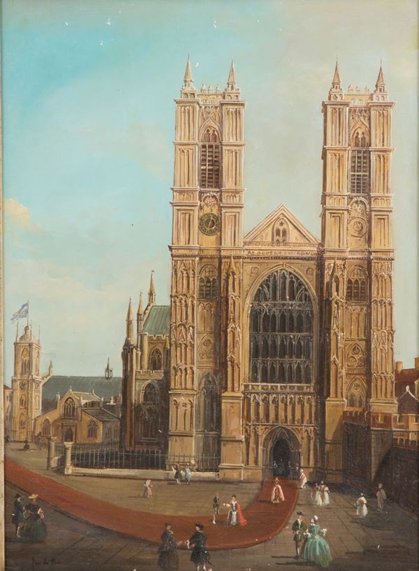 Oil painting on canvas depicting "WESTMINSTER ABBEY". Unidentified signature lower left. 20th century. In frame. Defects.