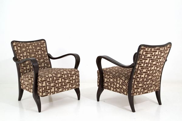 Pair of armchairs in lacquered wood with back and seat covered in fabric. 1960s.