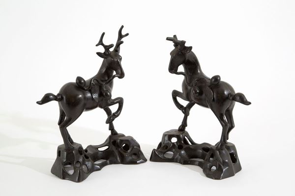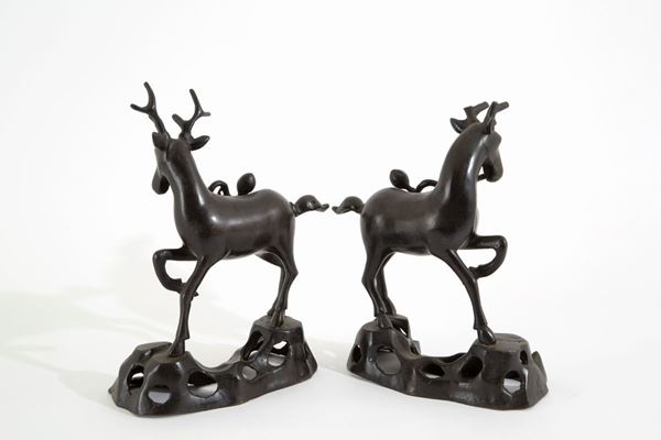 Pair of bronze sculptures depicting "DEER". China. XVIII century.