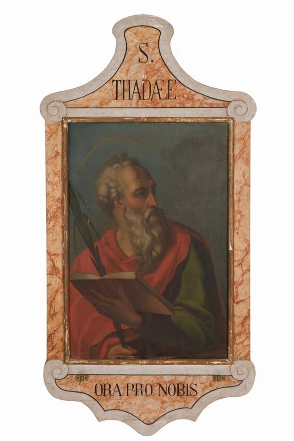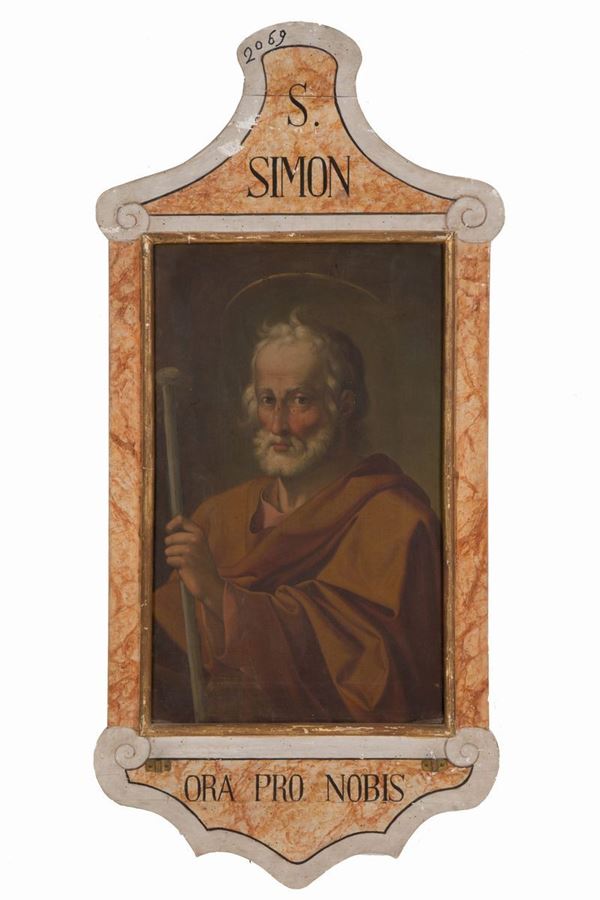 Pair of oil paintings on canvas depicting "SANTS SIMON AND JUDE THADDEUS". Nineteenth century. In a wooden frame lacquered with imitation marble. With inscriptions "S. Simone ora pro nobis" and "S. Thadaee ora pro nobis" on the frames. Defects and restorations.