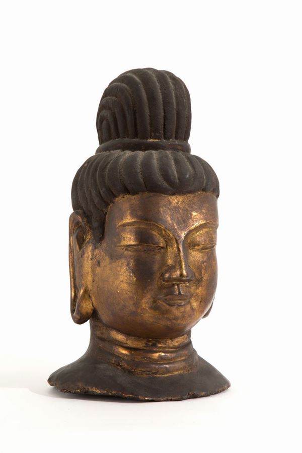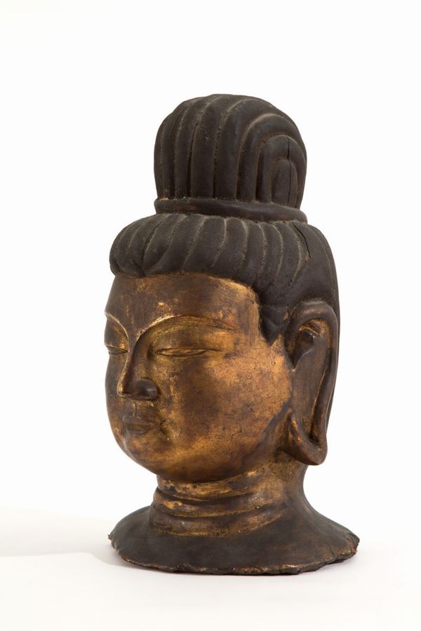 Papier mache sculpture depicting "BUDDHA HEAD". Wooden base. China. 19th century.