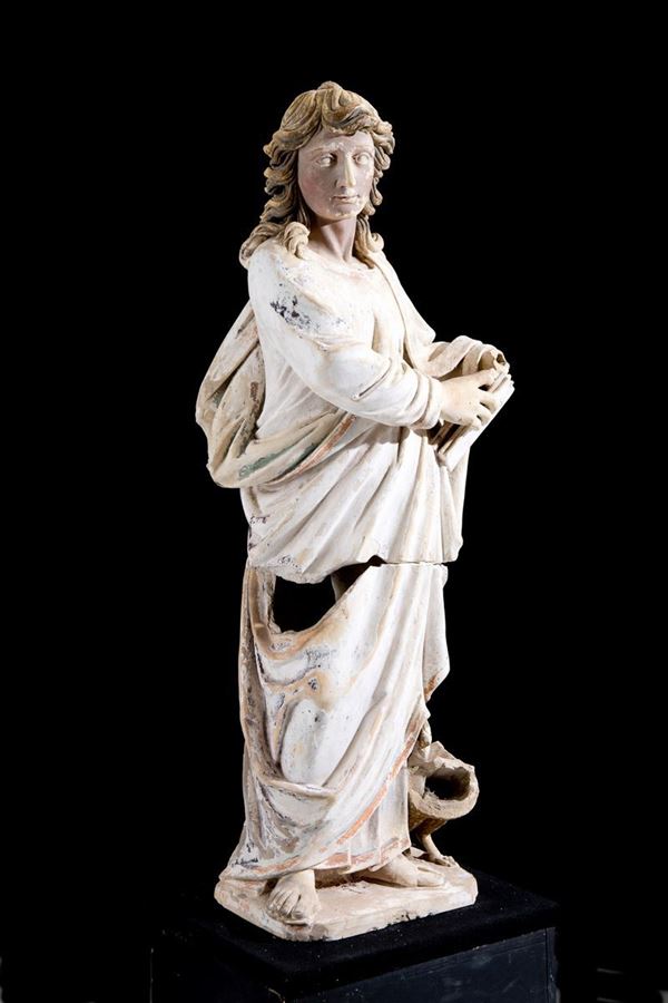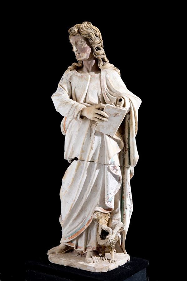 Partially painted terracotta sculpture in two pieces depicting "SAN GIOVANNI EVANGELISTA". XVIII century. Defects and breaks.