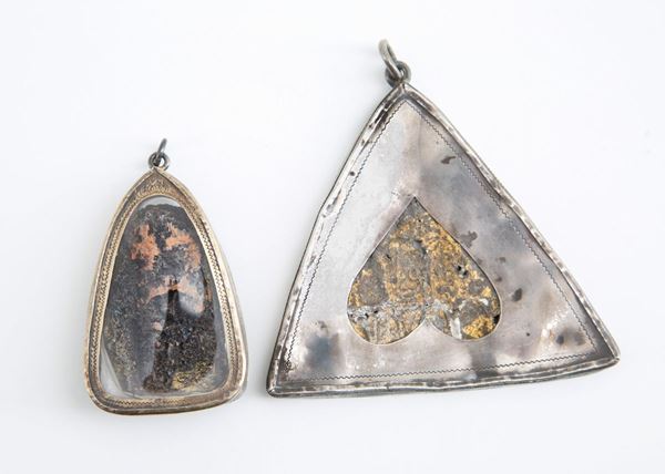 Two antique pendants, one in stone and one in silver, depicting "BUDDHA" in a silver frame. Thailand.