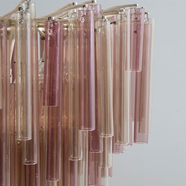 Twenty lights chandelier with smooth tubular glasses of different sizes and white painted metal structure. VENINI production, Murano. 70's.