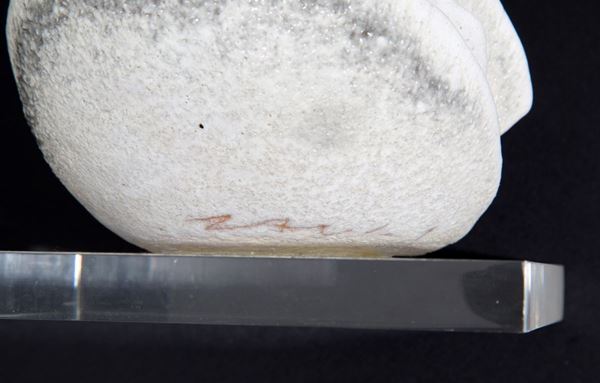 White glazed stoneware sculpture depicting "ZOLLE" with plexiglass base. Signed on the bottom.