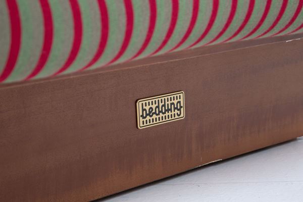Armchair Flying Carpet in wood covered with a carpet with a large padded edge. Backrest, armrest and cushion in polyurethane foam covered with colored fabrics. Side table in solid walnut. Production BEDDING PATENTS. 1974. With manufacturer's label and brochure.