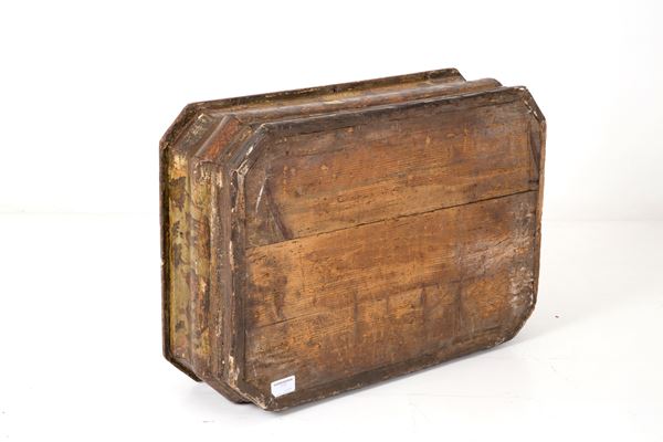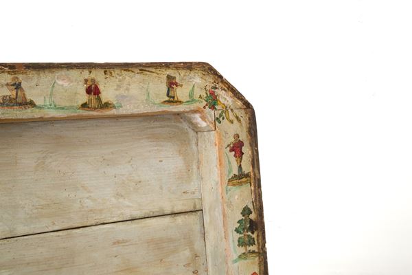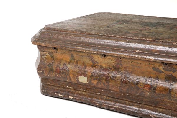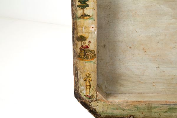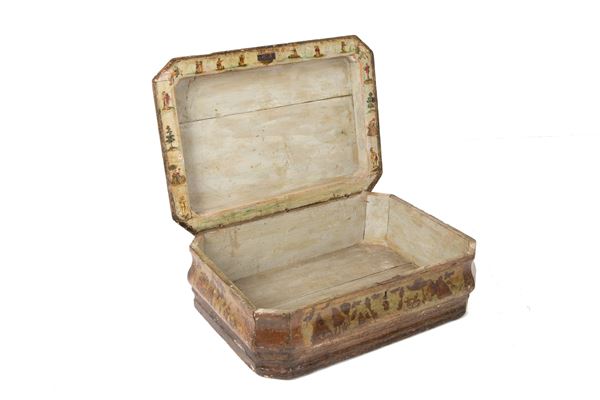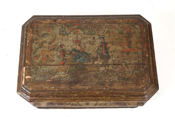 Large lacquered box with poor art decorations. Venice. 18th century. Defects.