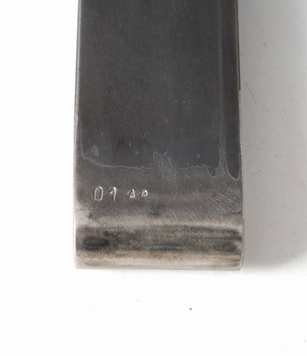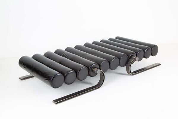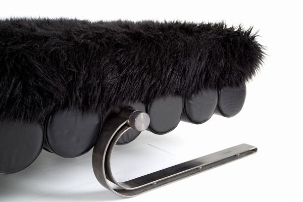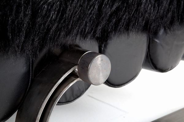 Daybed with brushed iron structure, black leather rolls and black synthetic fur covering. Signed and numbered 01/01 AP. Unique specimen. 1970s.