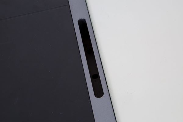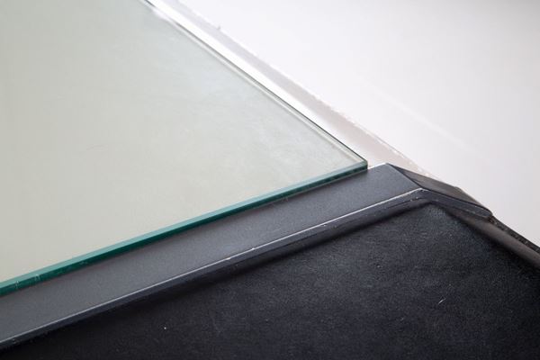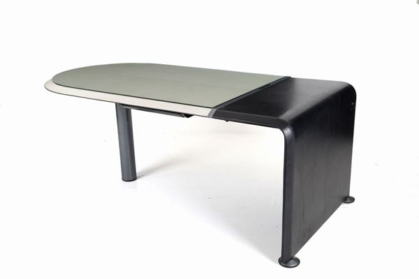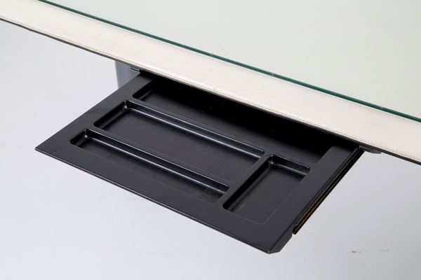 Wooden desk, painted metal leg and white leather with one pull-out drawer and tempered glass top. 80s. Defects.