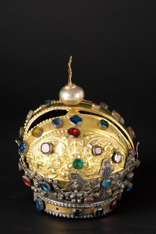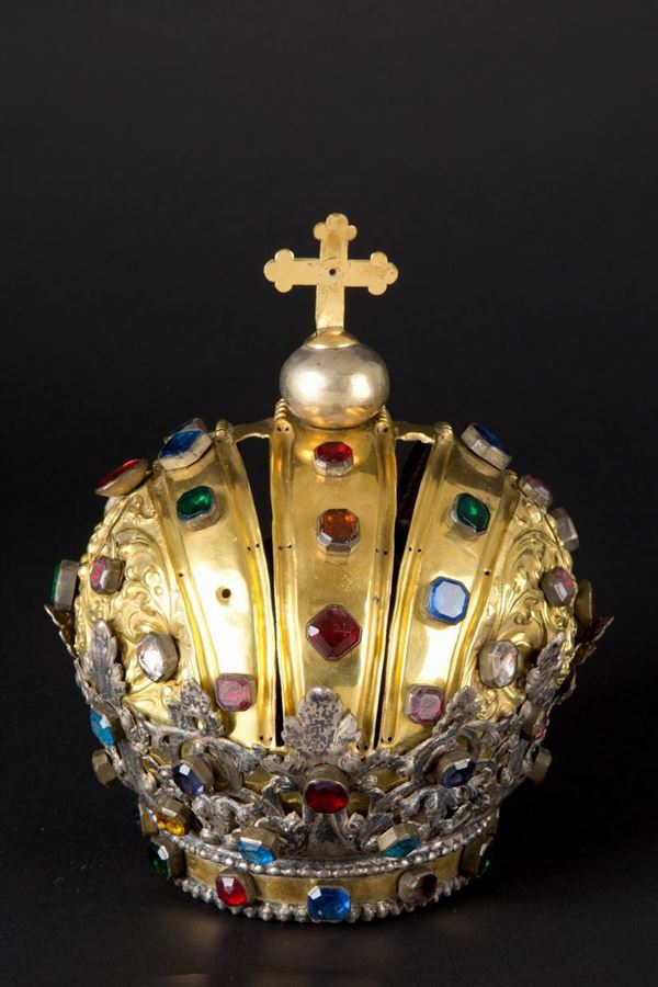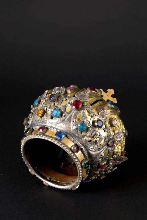 Golden metal crown with perforated silver foliage decorations and colored glass. 19th century. One glass missing.