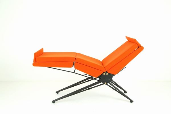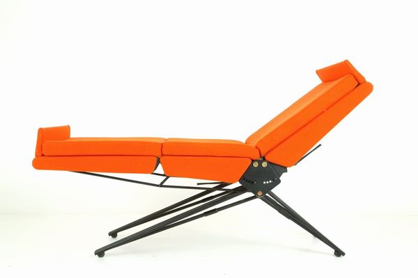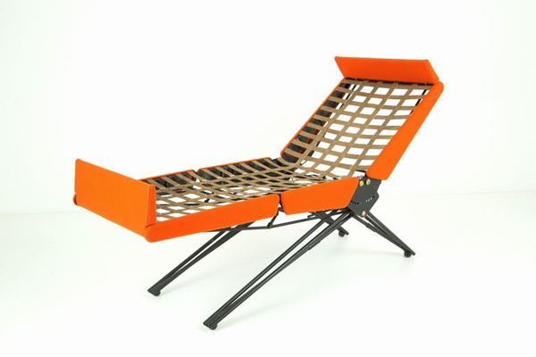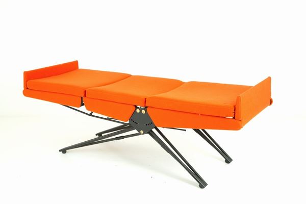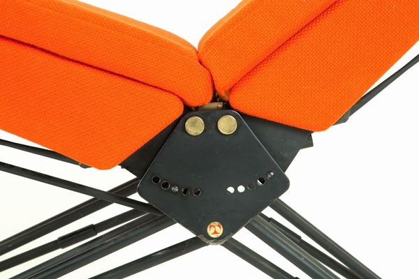 Daybed L77 in black painted metal and orange fabric. Fully adjustable frame with separate mechanisms for backrest and legs. TECNO production.