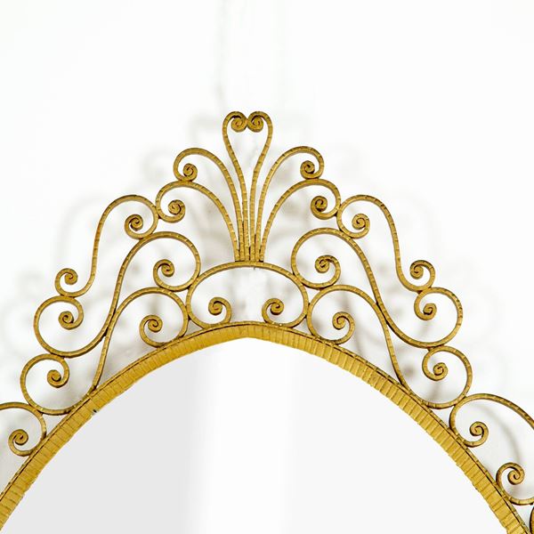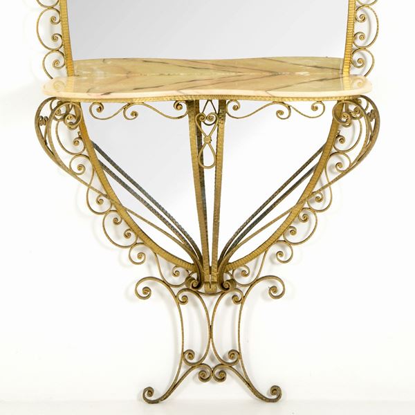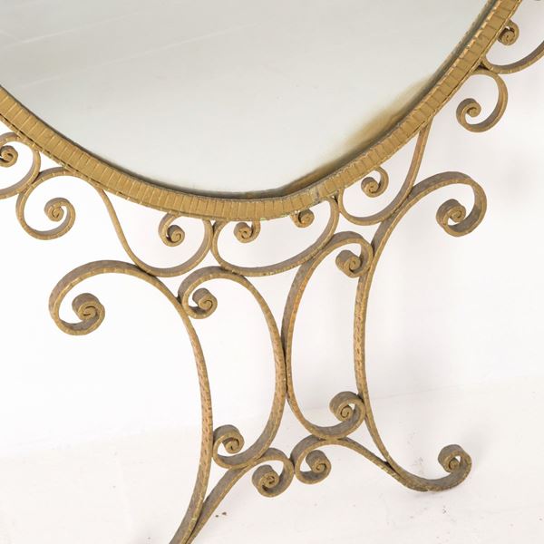 Mirror with console in wrought and gilded iron. Slight defects to the gilding.
