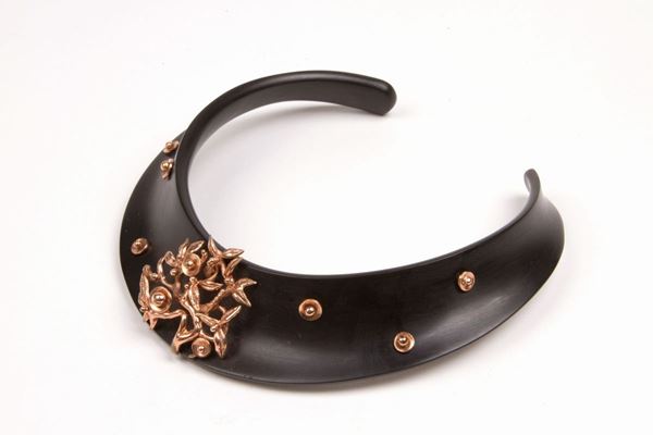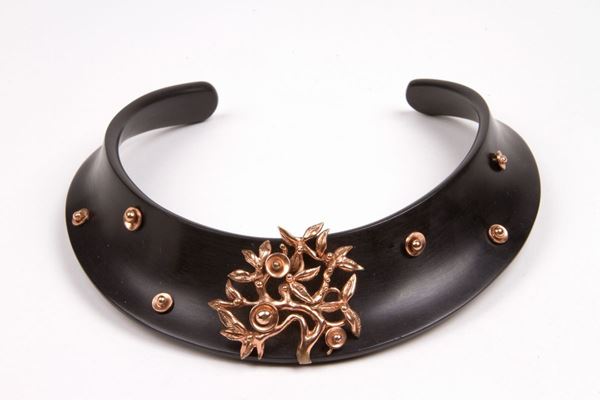 Methacrylate necklace with sculptures applied in gold plated silver with lost wax technique, depicting "TREE OF LIFE".