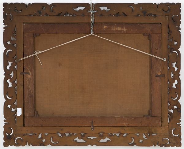 Oil painting on canvas depicting "BATTLE". In carved and gilded frame.