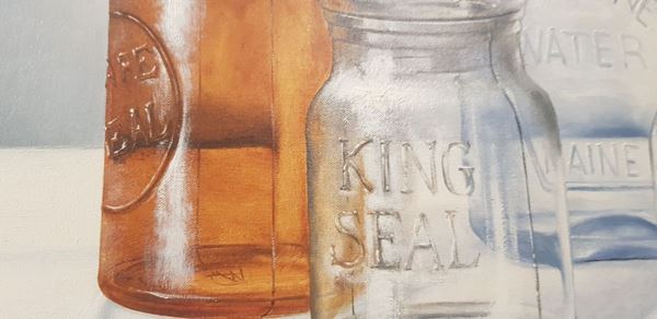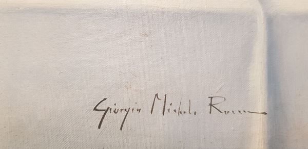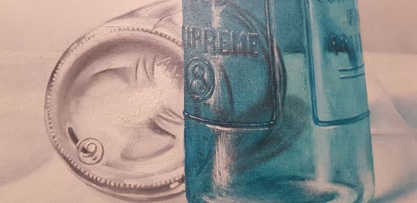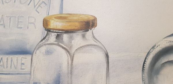 Oil painting on canvas depicting "GLASS BOTTLES". Signed GIORGIO MICHELE ROCCA lower right. In frame.