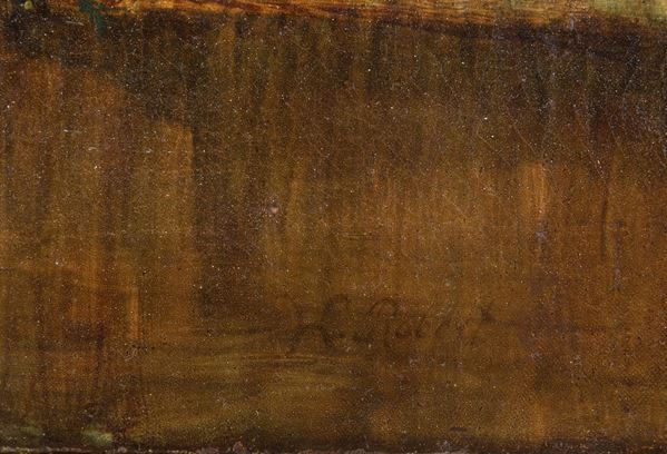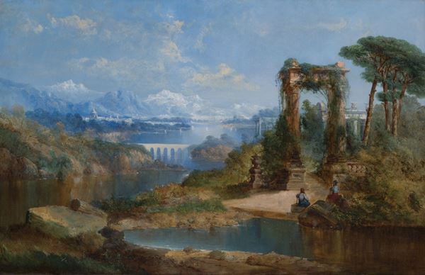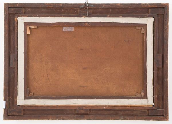 Oil painting on canvas depicting "LANDSCAPE WITH ARCHITECTURE AND FIGURES". Signed lower right. In frame. Small restorations and reinforcements of the edge of the canvas. With restoration report by Artes Restauri dated 16 April 2022.