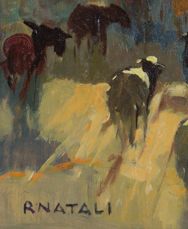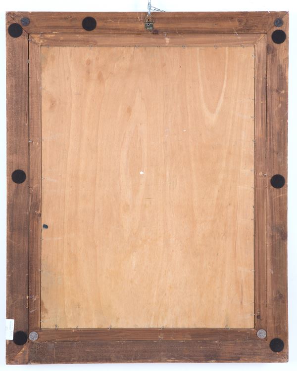 Oil painting on plywood depicting "LANDSCAPE WITH SHEPHERDS AND SHEEP". Signed lower left. In frame.