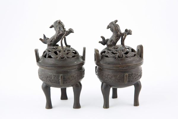 Pair of antique bronze censers decorated with fo dogs on the lid. China.