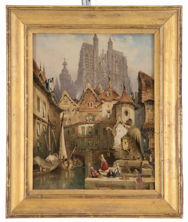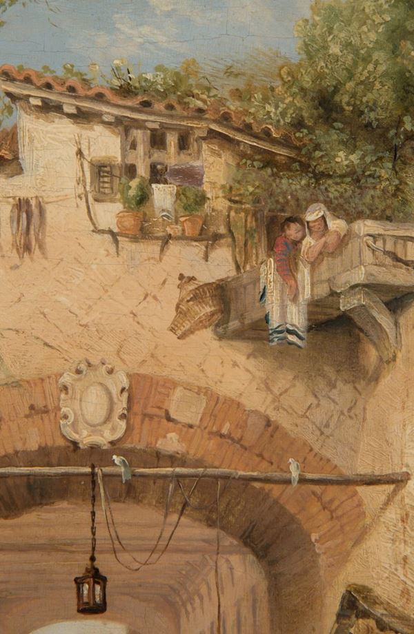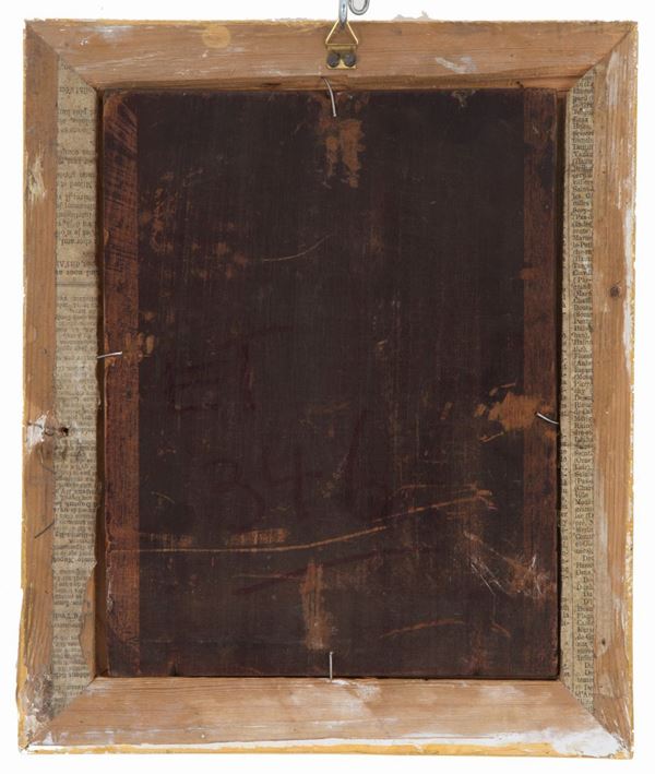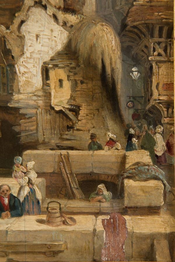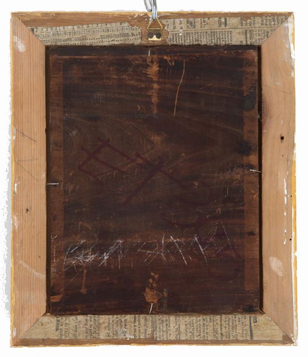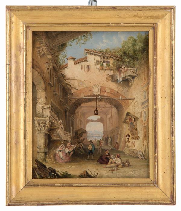 Pair of paintings on wood depicting "LANDSCAPES WITH LIFE SCENES". Nineteenth century. In a gilt frame.