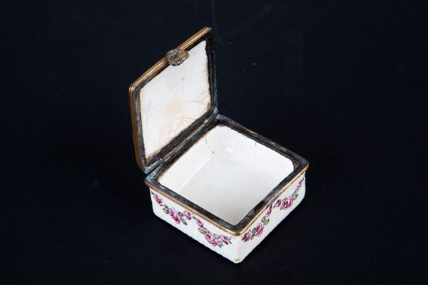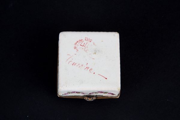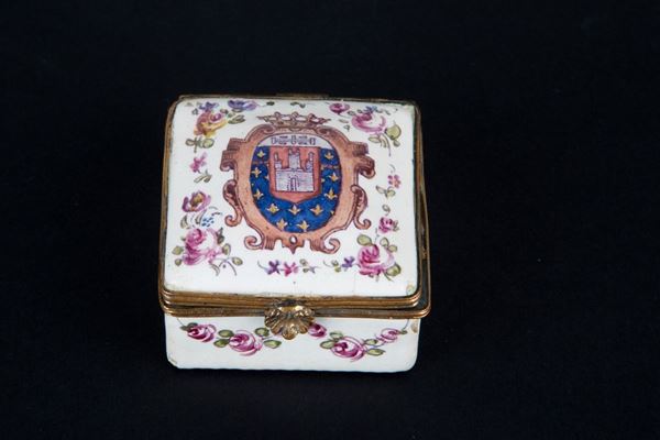 White porcelain box decorated in enamel with coat of arms and flowers. Marked LILLE under the base. France. 18th century.