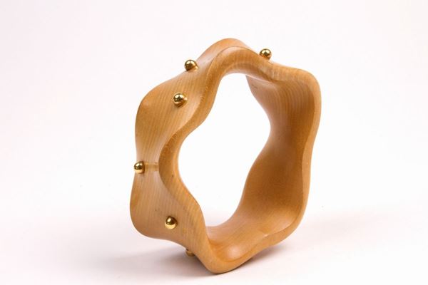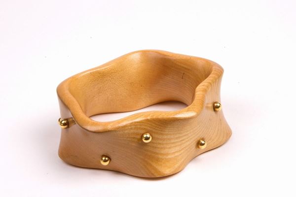 White maple ribbon bracelet with gold boule, gr. 4.25 approx. overall.