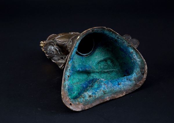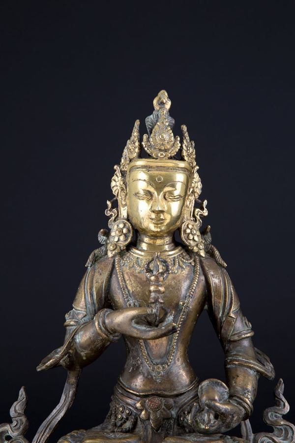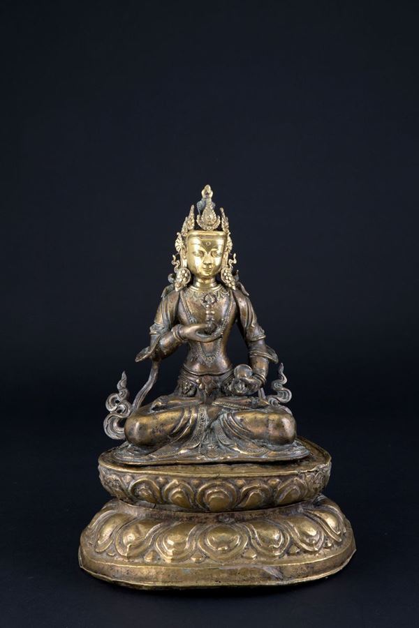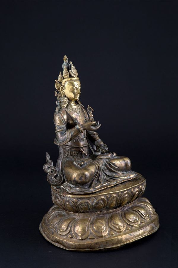 Gilt bronze and copper repousse sculpture depicting "BUDDHA SITTING ON DOUBLE LOTUS FLOWER". China. Defects.