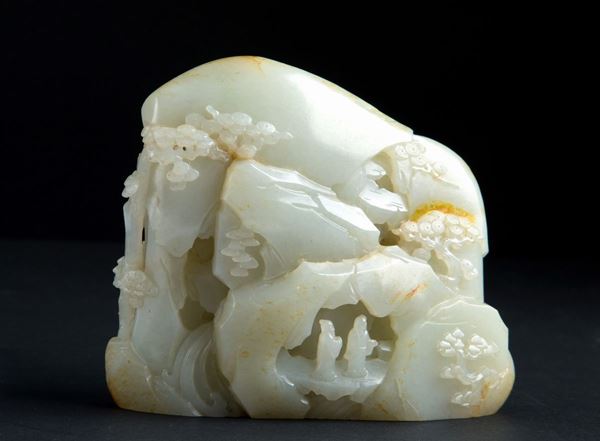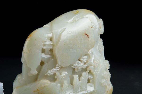 Finely carved jade sculpture depicting "LANDSCAPE WITH CHARACTERS". With writing on the front. China.