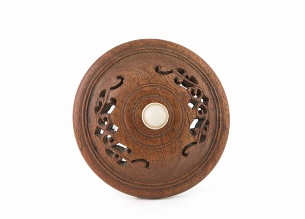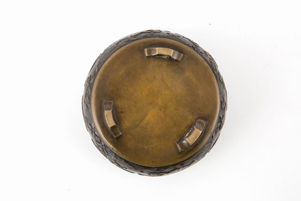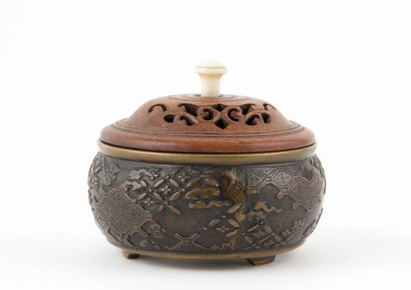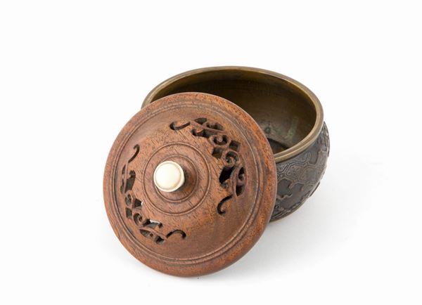 Small finely chiselled bronze censer with wooden lid. China.