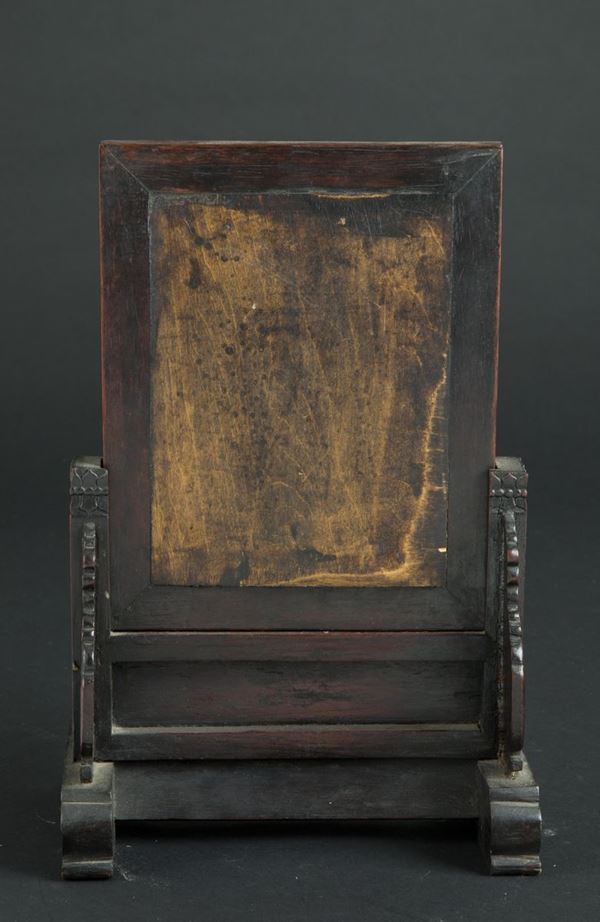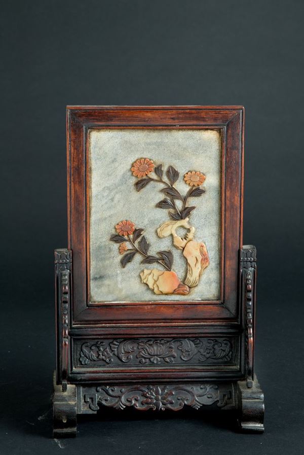 Small soapstone panel depicting "FLOWERS" mounted on an easel. China.