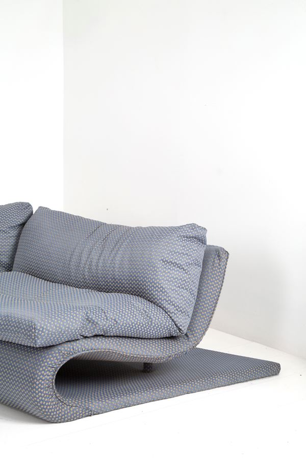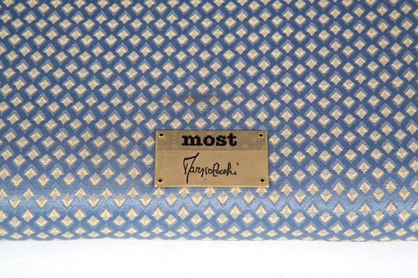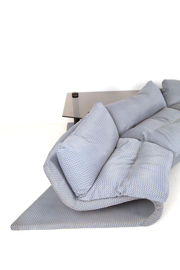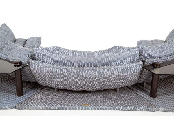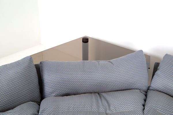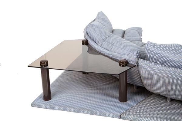 Modular pile-dwelling sofa in silk with two suspended tables in smoked glass. Production STUDIO MOST, Florence. With manufacturer's label. 70's.