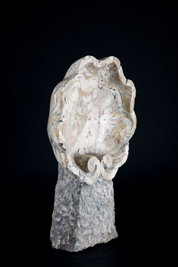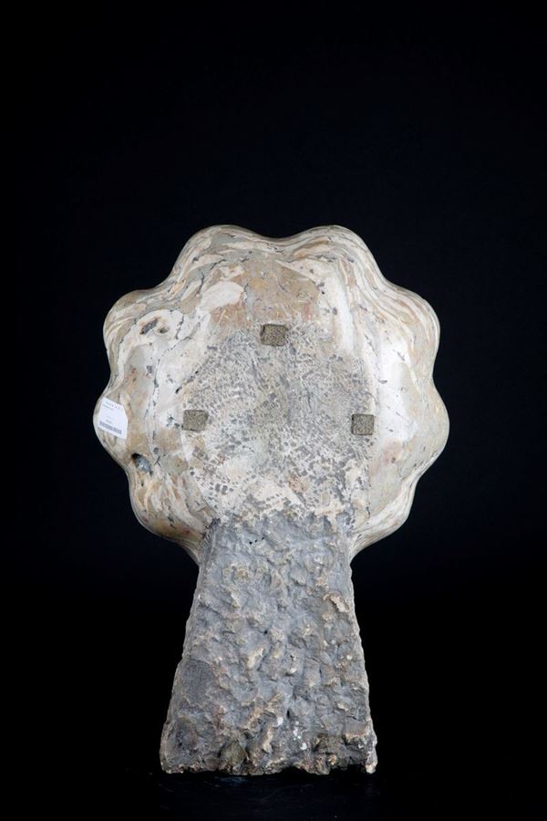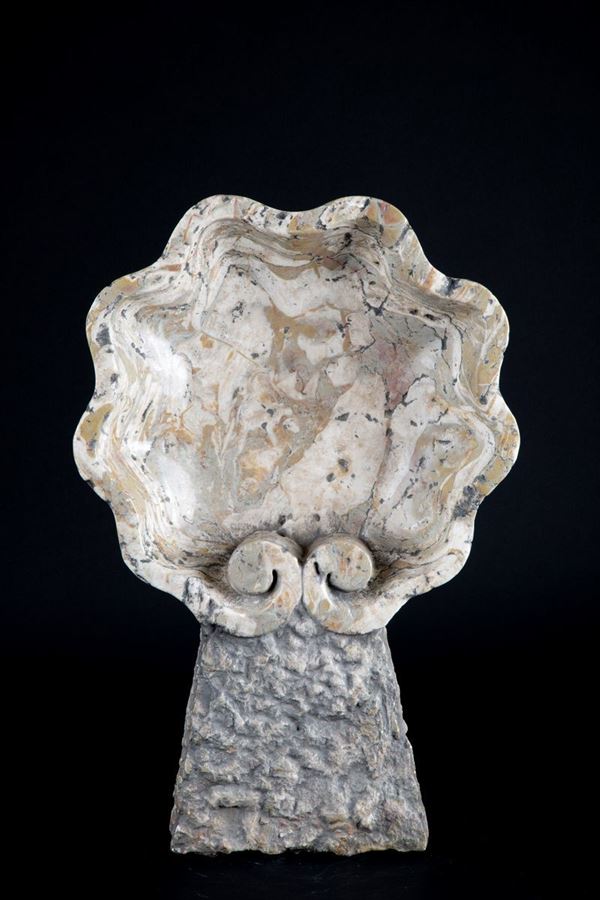 Wall stoup in Lumachella del Garda marble.