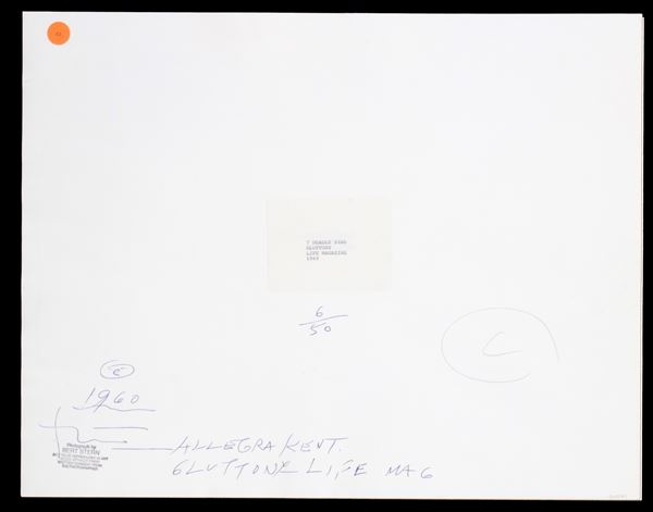 Gelatin-silver print "ALLEGRA KENT, GLUTTONY, 1960". Title, signature, date, copy number 6/50 in pen and artist's stamp on the back. 30x38cm on paper 39.5x50.5cm.