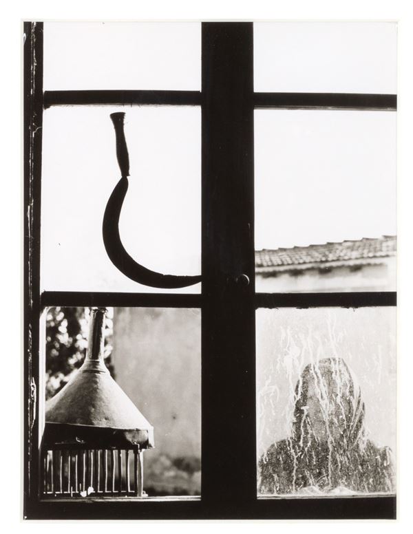 Vintage gelatin-silver print "FINESTRA CON GABBIA E IMBUTO, 1955". Signed, titled and dated in pencil on the back.
