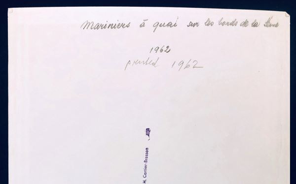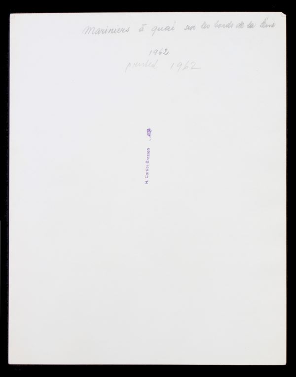 Gelatin-silver print "MARINIERS A QUAI SUR LES BORDS DE LA SEINE, 1962". Title in pencil and artist's stamp on the back. 24x16cm on paper 25.5x20cm.