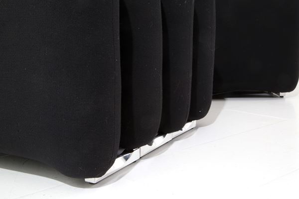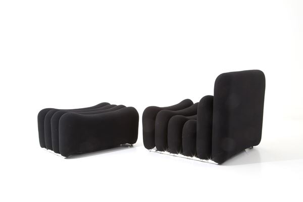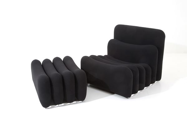 Armchair with Additional System footrest in metal and black fabric. SORMANI production. 1970s.