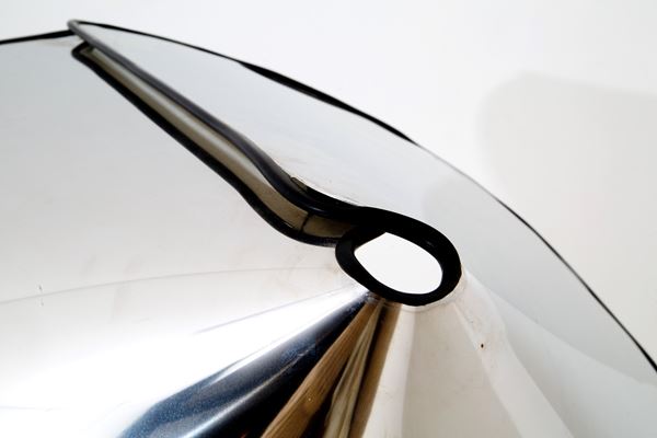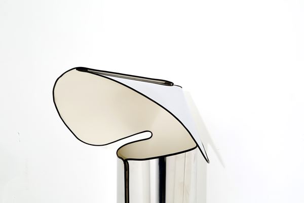 Chiara floor lamp made with a single sheet of flexible steel with a mirror finish on the outside and matt white on the inside and black rubber profile. FLOS production. 70s.
