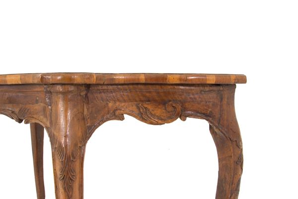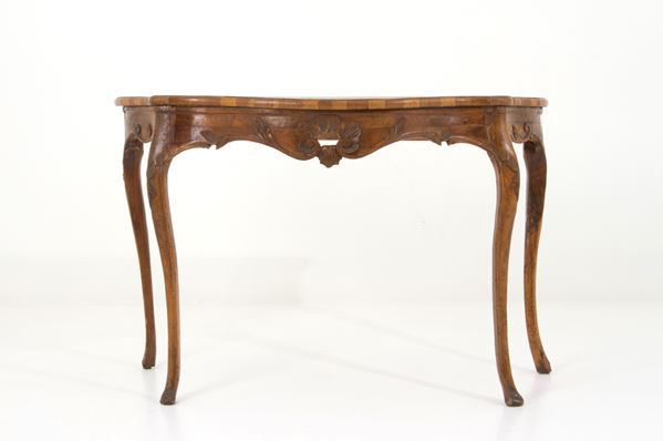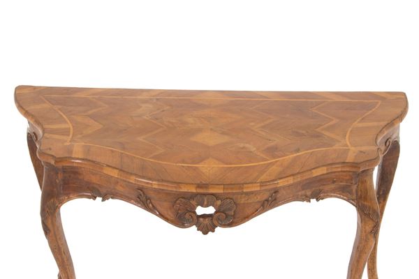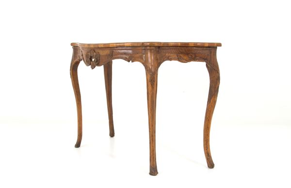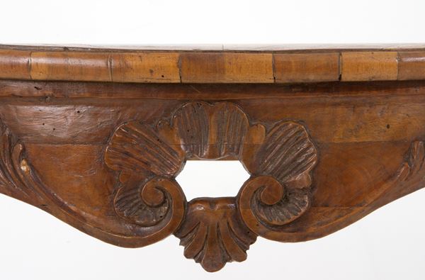 Console in carved wood with veneered and threaded top. Veneto. 18th century. Defects and restorations.