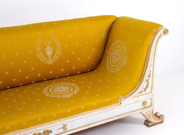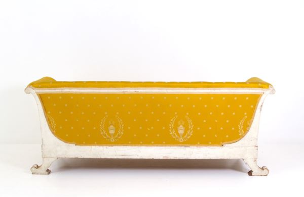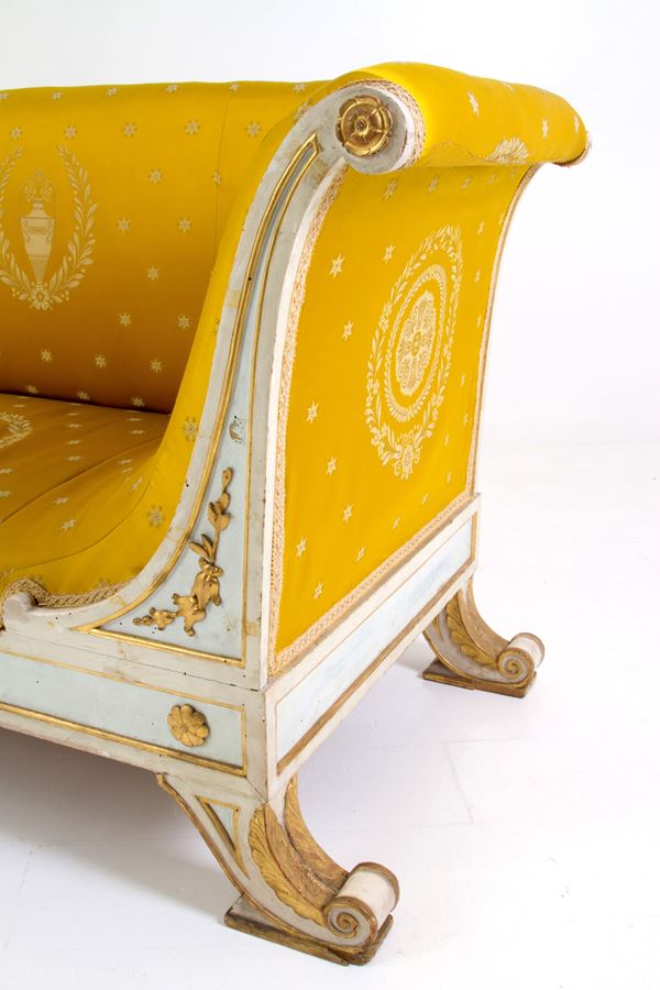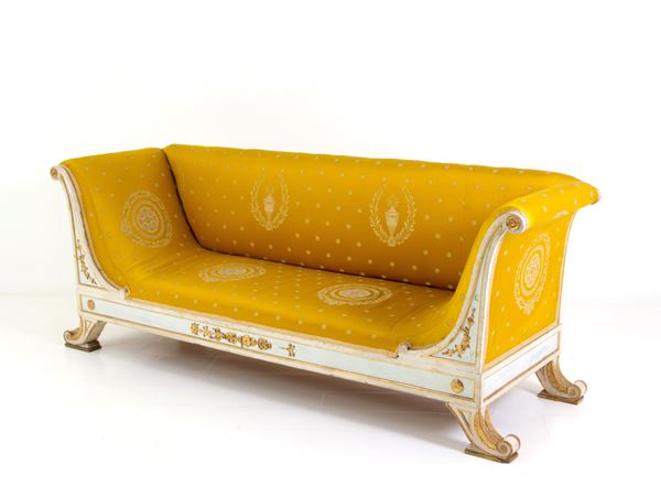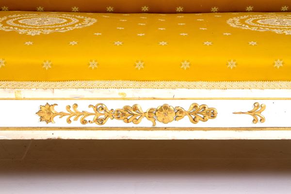 Corbeille sofa in lacquered and gilded wood covered in satin. Empire period. Defects.