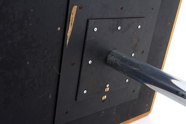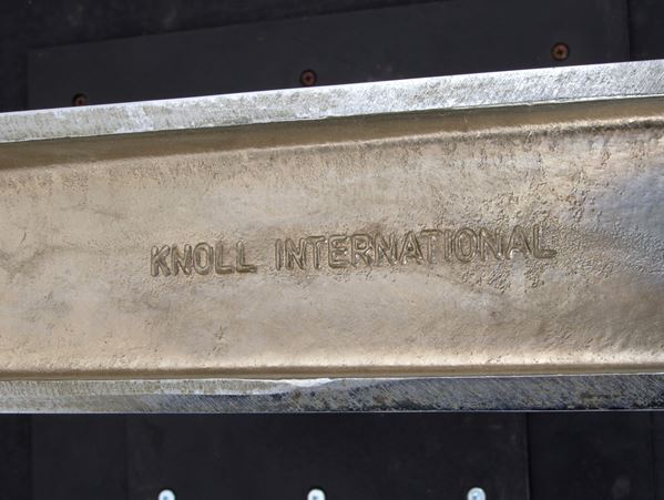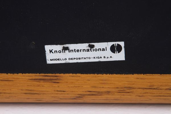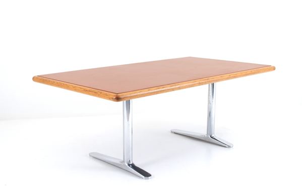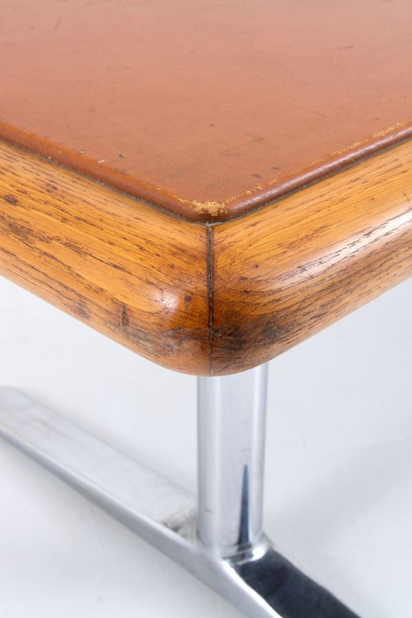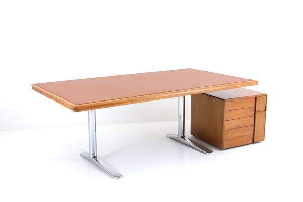 Steel desk with chest of drawers and wooden top covered in leather. KNOLL INTERNATIONAL production. With manufacturer's label under the top and marks on the feet. 60's. Wear and tear.
