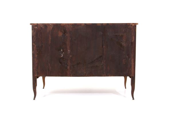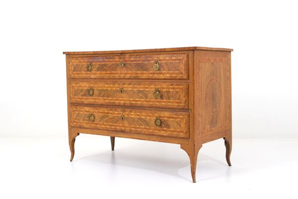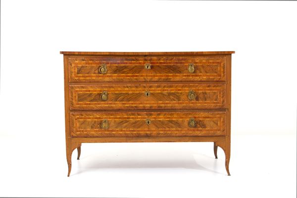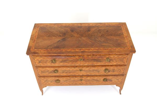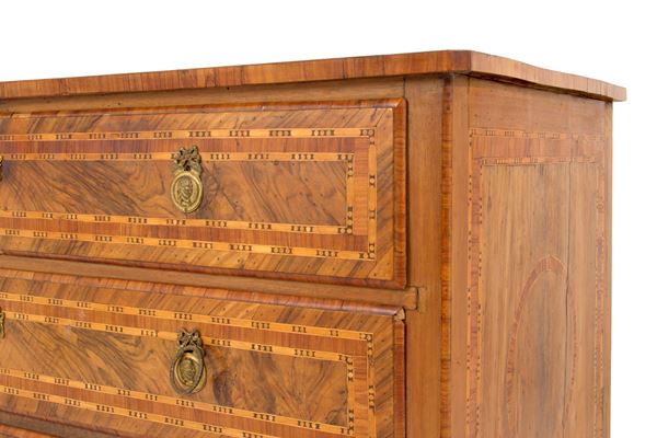 Veneered and threaded chest of drawers in various woods. Northern Italy. Late 18th century.