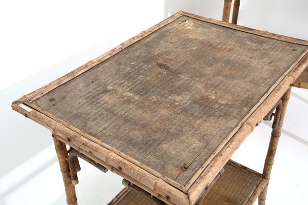 Etagere and coffee table in curved bamboo with sheet metal tips. Early 20th century. Defects. Coffee table: 78x68x48cm approx. Etagere: approx. 135x61x38 cm.