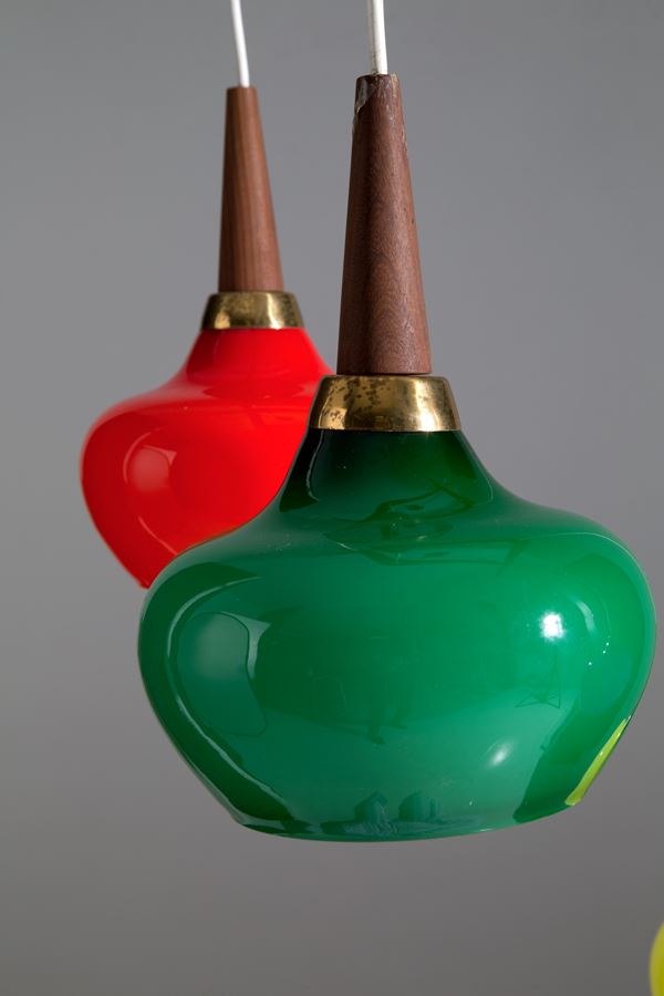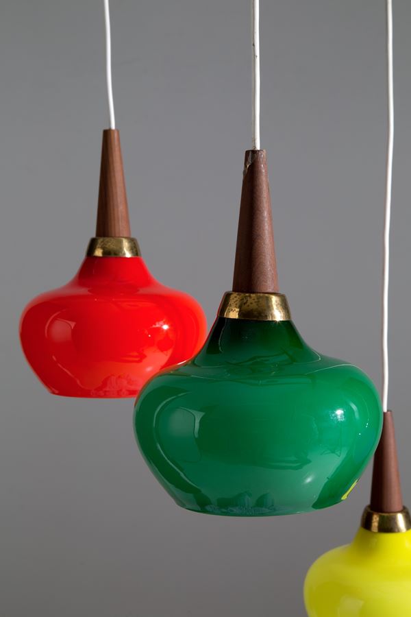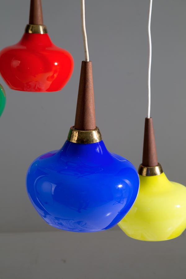 Chandelier with four lights of various colors in glass and wood. 70's.