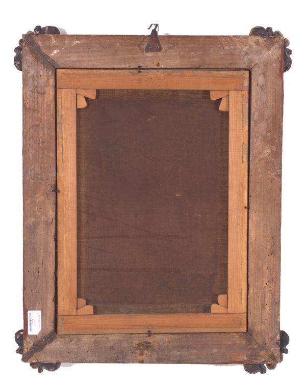 Oil painting on canvas depicting "HOLY FAMILY WITH SAINT JOHN, SAINT ELISABETTA AND ANGELS". XVII century. By Raphael Sanzio. In antique frame. Already relined and relined. Slight defects and restorations.