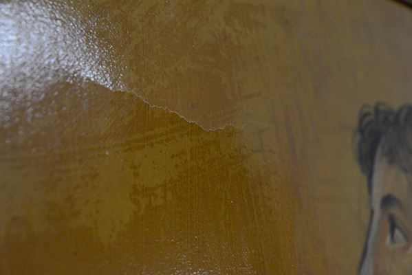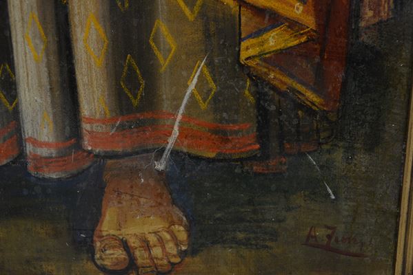 Oil painting on cardboard applied on canvas entitled ''PERSONAGGIO TOGATO''. 1950 approx. Signed lower right. Framed. Defects. Published in Nicoletta Colombo (ed.), Catalog raisonnĂ© of paintings and cartoons, vol. II, Leonardo Arte, Milan 1996, p. 161.